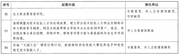 (二十)优化技术技能人才成长环境。设立“深圳工匠节”,加大对技术技能人才奖励力度,培育和传承工匠精神。设立职业教育深圳奖,面向全球奖励作出杰出贡献的个人或团队。清理调整对技术技能人才的歧视政策,建立符合技术技能人才特点的职称评审与职级晋升制度,同层次的高等职业学校毕业生在深圳市落户、就业、参加机关事业单位招聘、职称评审、职级晋升等方面与普通高校毕业生享受同等待遇。将符合条件的技术技能人才纳入公租房、人才住房和安居型商品房保障范围。实施“大国工匠”精英引领计划,鼓励高校招收技能大赛优秀选手和绝技绝艺技术技能人才。强化职业学校社会服务功能,建设一批民生服务学院、社区学院、行业培训学院,进一步营造劳动光荣、技能宝贵、创造伟大的良好社会风尚。