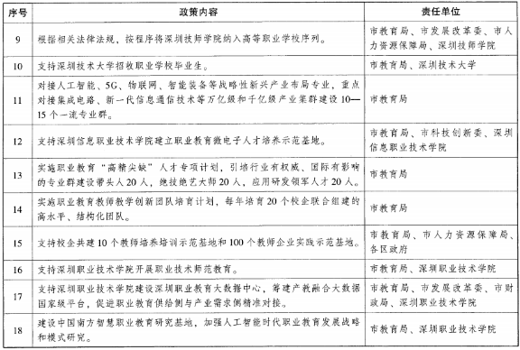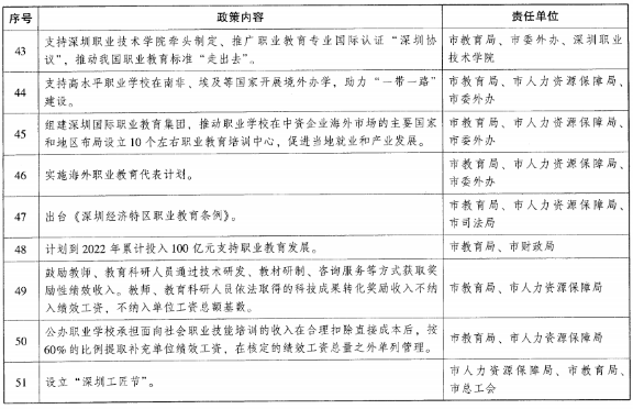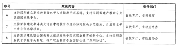 (十六)推动职业教育标准国际化。支持深圳依托新时代中国职业教育研究院,携手世界一流企业,借鉴国际先进标准,编制职业学校“双师型”教师、人才培养评价、信息化建设、专业建设等标准,重点开发具有中国特色和国际竞争优势的专业课程、教学管理模式和评价工具,构建衔接有序、国际领先的职业教育标准体系。支持国际相关标准组织常驻深圳,打造职业教育标准工作机构集聚地。举办国际职业教育标准论坛,推进国际性团体(联盟)标准互认。支持深圳职业技术学院牵头制定、推广职业教育专业国际认证“深圳协议”,推动我国职业教育标准“走出去”。