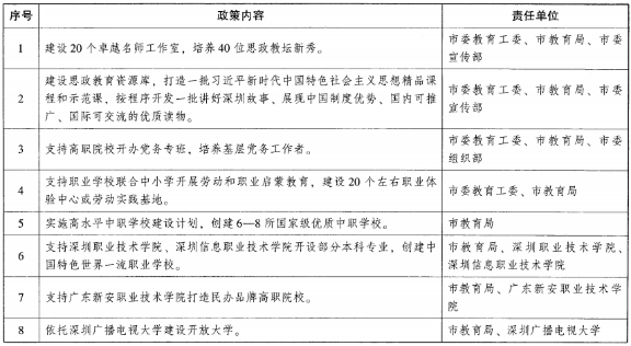 (三)建设一流职业学校。实施深圳高水平中职学校建设计划,支持深圳创建6—8所国家级优质中职学校。着力发展与区域高端产业相匹配、与一流高等职业教育相衔接、满足社会需要和市民期待的中等职业教育,形成中职、高职、本科层次职业教育一体化协同发展机制,推动中职学校优质特色发展。支持深圳职业技术学院、深圳信息职业技术学院开设部分本科专业,创建中国特色世界一流职业学校。支持广东新安职业技术学院打造民办品牌高职院校。依托深圳广播电视大学建设开放大学。支持广东省按程序将深圳技师学院纳入高等职业学校序列。支持深圳技术大学招收职业学校毕业生。支持有条件的高职院校建设科技园区,培育孵化育成体系,助推师生创新创业。加快推进学习型城市建设,高质量推动形式多样的学习型组织建设,持续办好全民终身学习活动周,推动创新创业教育、社区教育加快发展,为深圳先行示范区建设提供智力支持和人才保障。