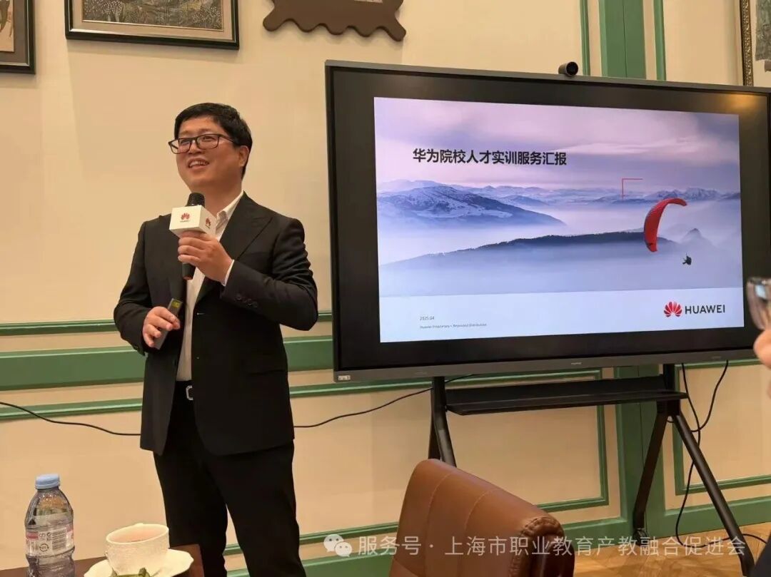 参观结束后,会议正式拉开帷幕。华为上海政企服务总监付党立发表欢迎致辞,对促进会各位理事的到来表示诚挚欢迎,详细介绍了华为公司发展历程、核心业务板块、技术创新成果,以及企业在职业教育产教融合领域的战略布局与合作愿景,表达了携手职业院校培育高素质技术技能人才的坚定决心。